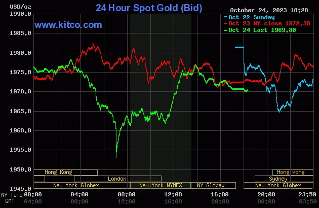 Vào lúc 5 giờ 20 phút sáng hôm nay 25/10 (giờ Việt Nam), giá vàng giao ngay thế giới niêm yết trên Kitco neo ở mức 1.970,30 USD/ounce, quy đổi tương đương 59,363 triệu đồng/lượng. Giá vàng kỳ hạn của Mỹ giảm 0,7% xuống 1.974,30 USD.