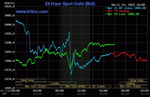 Vào lúc 5 giờ 00 phút sáng hôm nay 25/4 (giờ Việt Nam), giá vàng giao ngay thế giới niêm yết trên Kitco neo ở mức 1.988,90USD/ounce, quy đổi tương đương 57,306 triệu đồng/lượng.