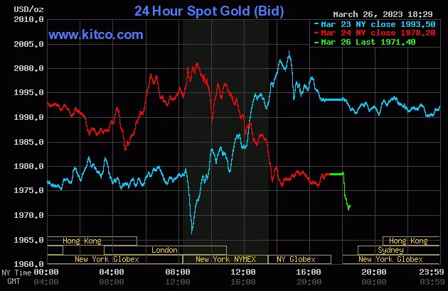 Vào lúc 5 giờ 30 phút sáng hôm nay 27/3 (giờ Việt Nam), giá vàng giao ngay thế giới niêm yết trên Kitco neo ở mức 1.971,4 USD/ounce, quy đổi tương đương 56,874 triệu đồng/lượng.