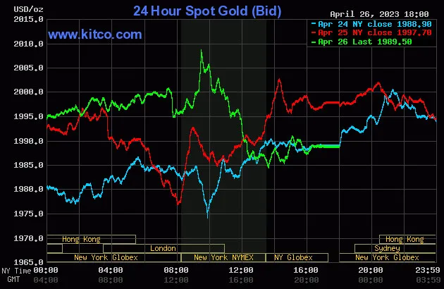 Vào lúc 5 giờ 00 phút sáng hôm nay 27/4 (giờ Việt Nam), giá vàng giao ngay thế giới niêm yết trên Kitco neo ở mức 1.989,50USD/ounce, quy đổi tương đương 57,323 triệu đồng/lượng.