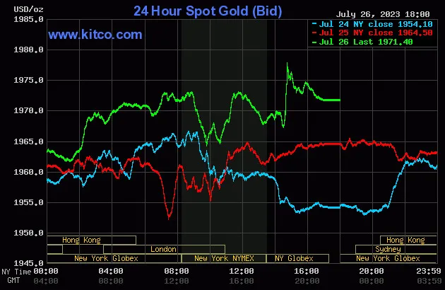 Vào lúc 5 giờ 00 phút sáng hôm nay 27/7 (giờ Việt Nam), giá vàng giao ngay thế giới niêm yết trên Kitco neo ở mức 1.971,40 USD/ounce, quy đổi tương đương 57,246 triệu đồng/lượng.