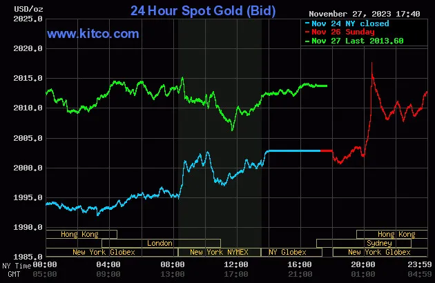 Vào lúc 5 giờ 40 phút hôm nay 28/11 (giờ Việt Nam), giá vàng giao ngay thế giới niêm yết trên Kitco neo ở mức 2.013,60 USD/ounce, quy đổi tương đương 59,894 triệu đồng/lượng.