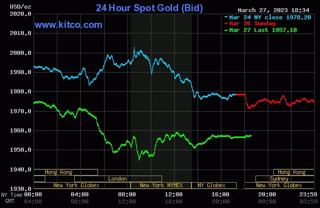 Vào lúc 5 giờ 35 phút sáng hôm nay 28/3 (giờ Việt Nam), giá vàng giao ngay thế giới niêm yết trên Kitco neo ở mức 1.957.10 USD/ounce, quy đổi tương đương 56,462 triệu đồng/lượng.