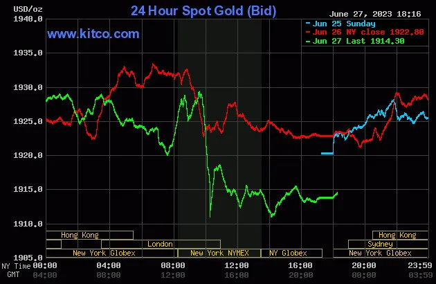 Vào lúc 5 giờ 15 phút sáng hôm nay 28/6 (giờ Việt Nam), giá vàng giao ngay thế giới niêm yết trên Kitco neo ở mức 1.914,30 USD/ounce, quy đổi tương đương 55,298 triệu đồng/lượng.