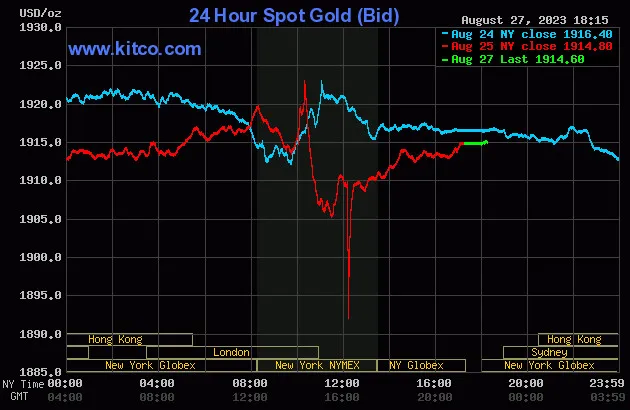 Vào lúc 5 giờ 15 phút sáng hôm nay 28/8 (giờ Việt Nam), giá vàng giao ngay thế giới niêm yết trên Kitco neo ở mức 1.914,60 USD/ounce, quy đổi tương đương 56,333 triệu đồng/lượng.