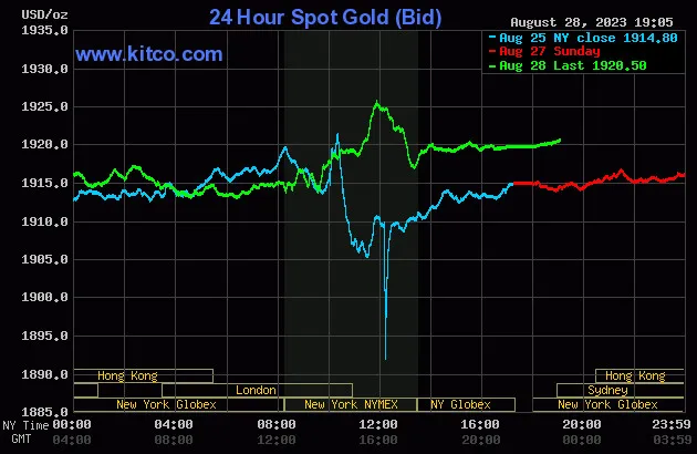 Vào lúc 6 giờ 00 phút sáng hôm nay 29/8 (giờ Việt Nam), giá vàng giao ngay thế giới niêm yết trên Kitco neo ở mức 1.920,50 USD/ounce, quy đổi tương đương 56,763 triệu đồng/lượng.