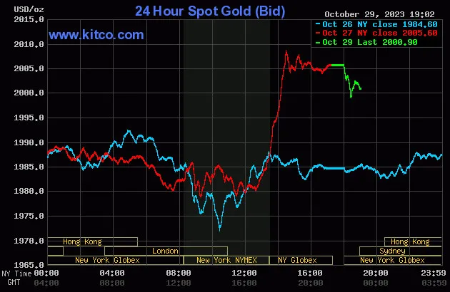 Vào lúc 6 giờ 00 phút sáng hôm nay 30/10 (giờ Việt Nam), giá vàng giao ngay thế giới niêm yết trên Kitco neo ở mức 2.000,90USD/ounce, quy đổi tương đương 60,284 triệu đồng/lượng.