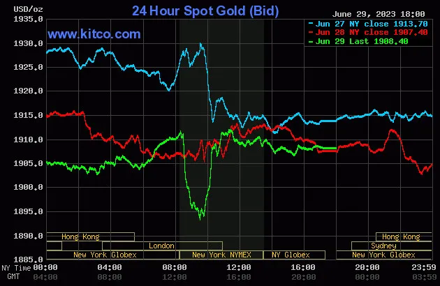 Vào lúc 5 giờ 00 phút sáng hôm nay 30/6 (giờ Việt Nam), giá vàng giao ngay thế giới niêm yết trên Kitco neo ở mức 1.908,40USD/ounce, quy đổi tương đương 55,174 triệu đồng/lượng.