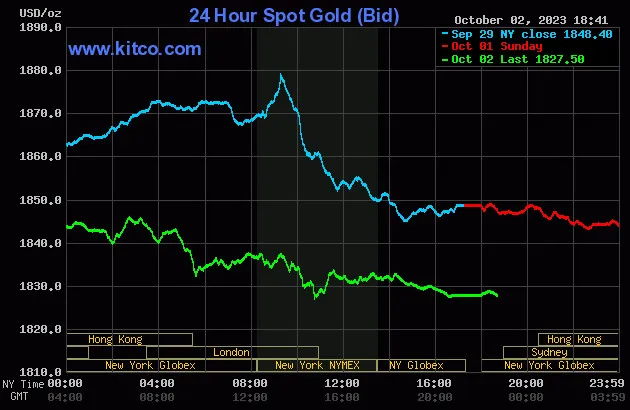 Vào lúc 5 giờ 40 phút sáng hôm nay 3/10 (giờ Việt Nam), giá vàng giao ngay thế giới niêm yết trên Kitco neo ở mức 1.827,50 USD/ounce, quy đổi tương đương 54,528 triệu đồng/lượng.