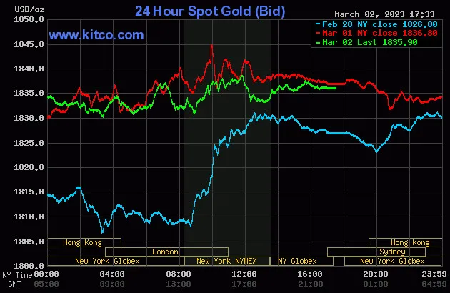 Vào lúc 5 giờ 30 phút sáng hôm nay 3/3 (giờ Việt Nam), giá vàng giao ngay thế giới niêm yết trên Kitco neo ở mức 1.835,9 USD/ounce, quy đổi tương đương 53,065 triệu đồng/lượng.
