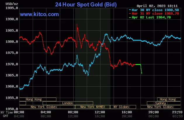 Vào lúc 5 giờ 10 phút sáng hôm nay 3/4 (giờ Việt Nam), giá vàng giao ngay thế giới niêm yết trên Kitco neo ở mức 1.964,70 USD/ounce, quy đổi tương đương 56,561 triệu đồng/lượng.