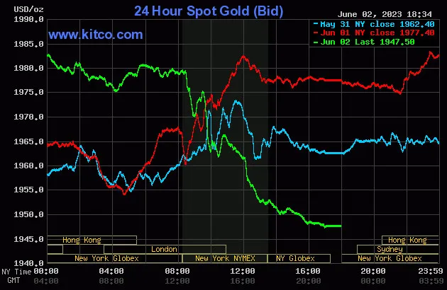 Vào lúc 5 giờ 35 phút sáng hôm nay 3/6 (giờ Việt Nam), giá vàng giao ngay thế giới niêm yết trên Kitco neo ở mức 1.947,50USD/ounce, quy đổi tương đương 56,114 triệu đồng/lượng.