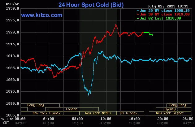 Vào lúc 5 giờ 35 phút sáng hôm nay 3/7 (giờ Việt Nam), giá vàng giao ngay thế giới niêm yết trên Kitco neo ở mức 1.918,60 USD/ounce, quy đổi tương đương 55,515 triệu đồng/lượng.