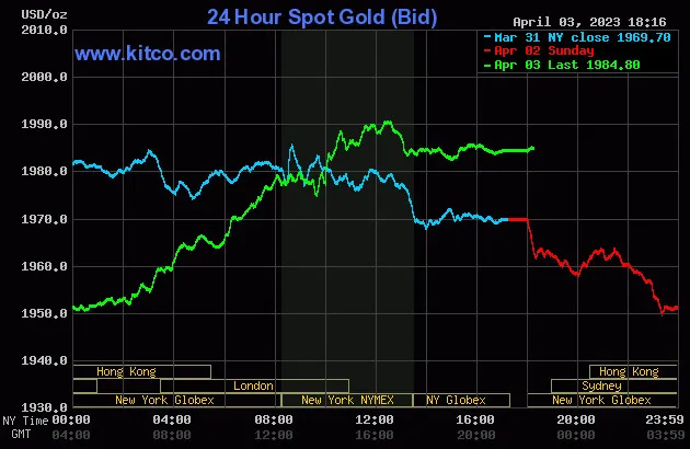 Vào lúc 5 giờ 15 phút sáng hôm nay 4/4 (giờ Việt Nam), giá vàng giao ngay thế giới niêm yết trên Kitco neo ở mức 1.984,80 USD/ounce, quy đổi tương đương 57,188 triệu đồng/lượng.