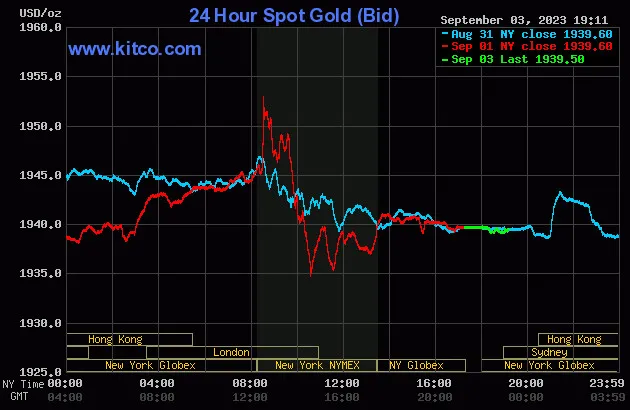 Vào lúc 6 giờ 10 phút sáng hôm nay 4/9 (giờ Việt Nam), giá vàng giao ngay thế giới niêm yết trên Kitco neo ở mức 1.939,50 USD/ounce, quy đổi tương đương 57,277 triệu đồng/lượng.