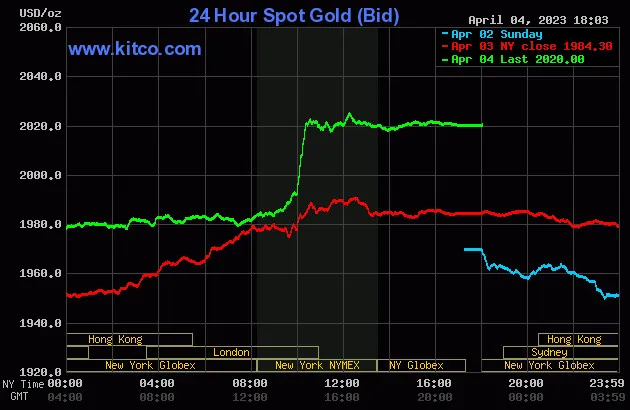 Vào lúc 5 giờ 00 phút sáng hôm nay 5/4 (giờ Việt Nam), giá vàng giao ngay thế giới niêm yết trên Kitco neo ở mức 2.020 USD/ounce, quy đổi tương đương 58,165 triệu đồng/lượng.