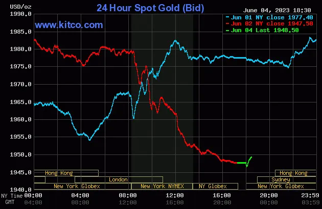 Vào lúc 5 giờ 30 phút sáng hôm nay 5/6 (giờ Việt Nam), giá vàng giao ngay thế giới niêm yết trên Kitco neo ở mức 1.948,50 USD/ounce, quy đổi tương đương 56,143 triệu đồng/lượng.