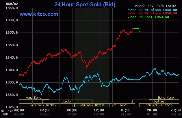 Vào lúc 6 giờ 00 phút sáng hôm nay 6/3 (giờ Việt Nam), giá vàng giao ngay thế giới niêm yết trên Kitco neo ở mức 1.853,6 USD/ounce, quy đổi tương đương 53,537 triệu đồng/lượng.