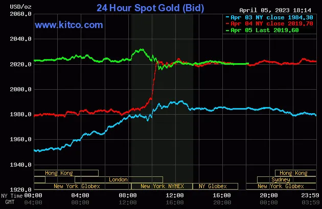 Vào lúc 5 giờ 15 phút sáng hôm nay 6/4 (giờ Việt Nam), giá vàng giao ngay thế giới niêm yết trên Kitco neo ở mức 2.019.60USD/ounce, quy đổi tương đương 58,116 triệu đồng/lượng.