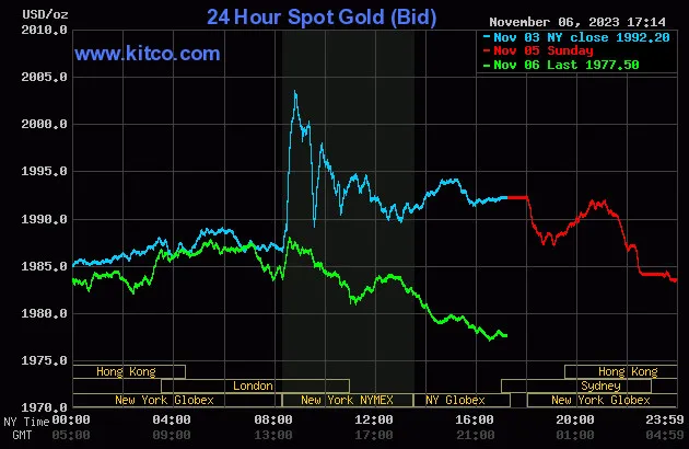 Vào lúc 5 giờ 15 phút sáng hôm nay 7/11 (giờ Việt Nam), giá vàng giao ngay thế giới niêm yết trên Kitco neo ở mức 1.977,50USD/ounce, quy đổi tương đương 59,026 triệu đồng/lượng.