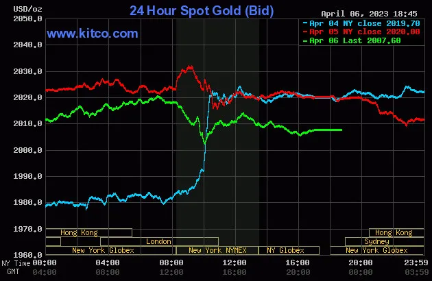 Vào lúc 5 giờ 45 phút sáng hôm nay 7/4 (giờ Việt Nam), giá vàng giao ngay thế giới niêm yết trên Kitco neo ở mức 2.007,60USD/ounce, quy đổi tương đương 57,771 triệu đồng/lượng.