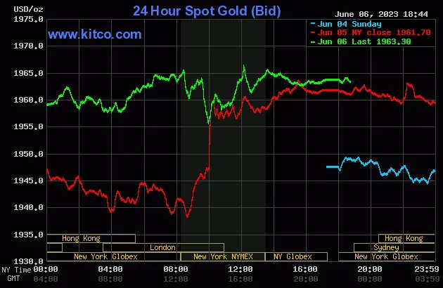 Vào lúc 5 giờ 45 phút sáng hôm nay 7/6 (giờ Việt Nam), giá vàng giao ngay thế giới niêm yết trên Kitco neo ở mức 1.963,30 USD/ounce, quy đổi tương đương 56,593 triệu đồng/lượng.