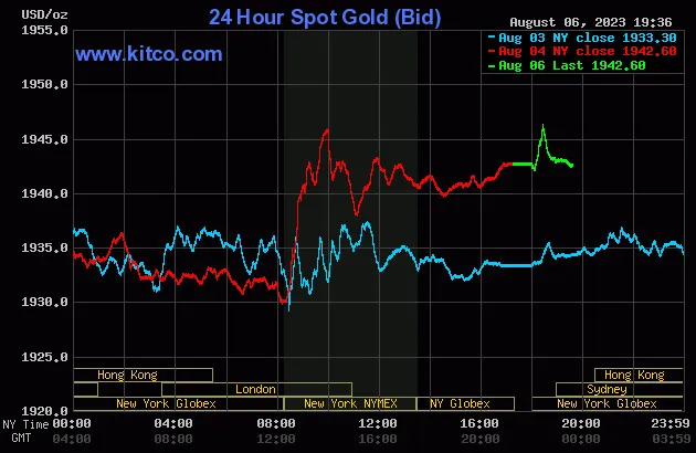 Vào lúc 6 giờ 35 phút sáng hôm nay 7/8 (giờ Việt Nam), giá vàng giao ngay thế giới niêm yết trên Kitco neo ở mức 1.942,70 USD/ounce, quy đổi tương đương 56,544 triệu đồng/lượng.