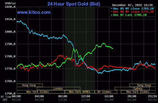 Vào lúc 4 giờ 40 phút sáng hôm nay 8/12 (giờ Việt Nam), giá vàng giao ngay thế giới niêm yết trên Kitco neo ở mức 1.786.10 USD/ounce, quy đổi tương đương 51,657 triệu đồng/lượng.