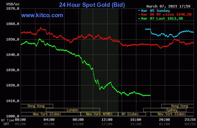 Vào lúc 6 giờ 00 phút sáng hôm nay 8/3 (giờ Việt Nam), giá vàng giao ngay thế giới niêm yết trên Kitco neo ở mức 1.813,3 USD/ounce, quy đổi tương đương 52,288 triệu đồng/lượng.