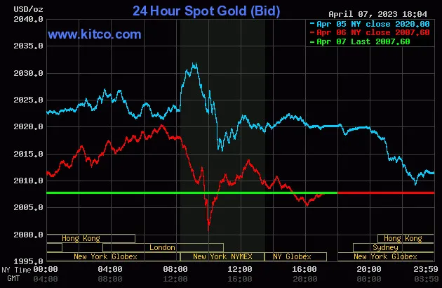 Vào lúc 5 giờ 05 phút sáng hôm nay 8/4 (giờ Việt Nam), giá vàng giao ngay thế giới niêm yết trên Kitco neo ở mức 2.007,6 USD/ounce, quy đổi tương đương 57,771 triệu đồng/lượng.