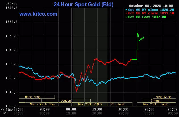 Vào lúc 6 giờ 00 phút sáng hôm nay 9/10 (giờ Việt Nam), giá vàng giao ngay thế giới niêm yết trên Kitco neo ở mức 1.847,50USD/ounce, quy đổi tương đương 55,260 triệu đồng/lượng.