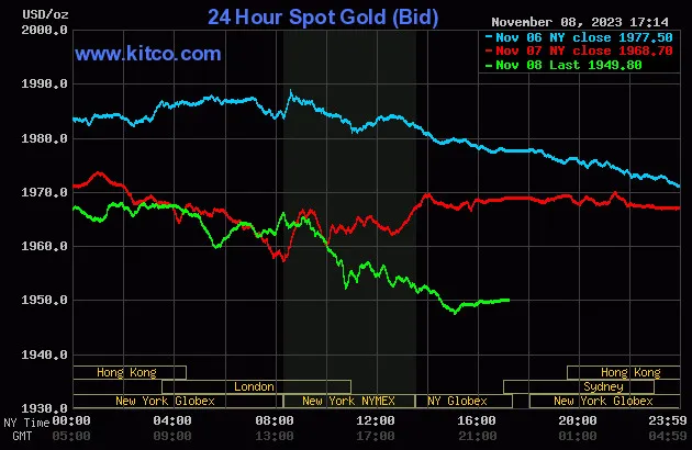 Vào lúc 5 giờ 15 phút sáng hôm nay 9/11 (giờ Việt Nam), giá vàng giao ngay thế giới niêm yết trên Kitco neo ở mức 1.949,80 USD/ounce, quy đổi tương đương 58,270 triệu đồng/lượng.