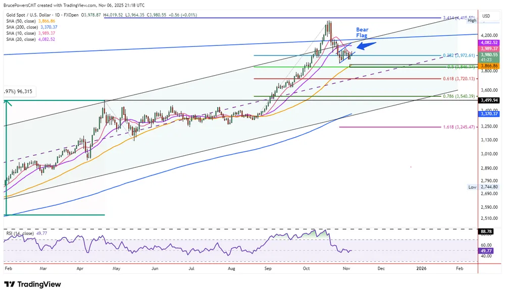Theo chuyên gia phân tích Bruce Powers, diễn biến này cho thấy nỗ lực phục hồi của phe mua đã thất bại và đường trung bình 10 ngày (hiện ở 3.989 USD) tiếp tục đóng vai trò là ngưỡng kháng cự động quan trọng. Việc giá đóng cửa thấp hơn ngưỡng này khẳng định xu hướng giảm ngắn hạn vẫn chiếm ưu thế.