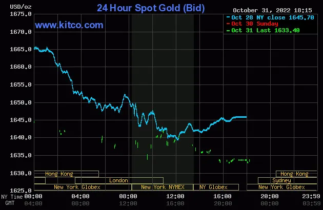 Vào lúc 5 giờ 15 phút sáng hôm nay 01/11 (giờ Việt Nam), giá vàng giao ngay thế giới niêm yết trên Kitco giảm 17,6 USD so với cùng giờ vào sáng hôm qua, neo ở mức 1.633,40 USD/ounce, quy đổi tương đương 48,889 triệu đồng/lượng.