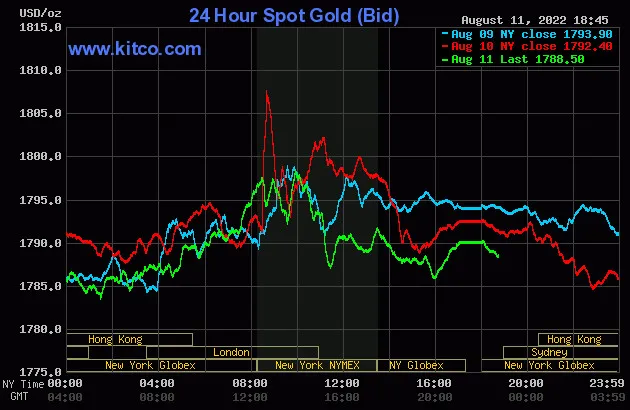Vào lúc 5 giờ 45 phút sáng hôm nay 12/8 (giờ Việt Nam), giá vàng giao ngay thế giới niêm yết trên Kitco giảm 2,6 USD so với cùng giờ vào sáng hôm qua, neo ở mức 1.788,50 USD/ounce, quy đổi tương đương 50,426 triệu đồng/lượng.