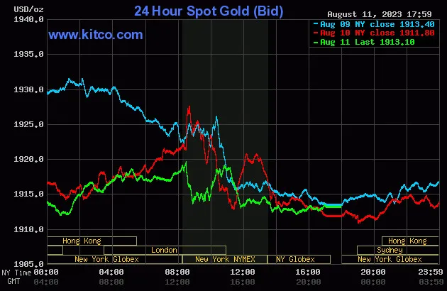 Vào lúc 5 giờ 00 phút sáng hôm nay 12/8 (giờ Việt Nam), giá vàng giao ngay thế giới niêm yết trên Kitco neo ở mức 1.913.10 USD/ounce, quy đổi tương đương 55,729 triệu đồng/lượng.