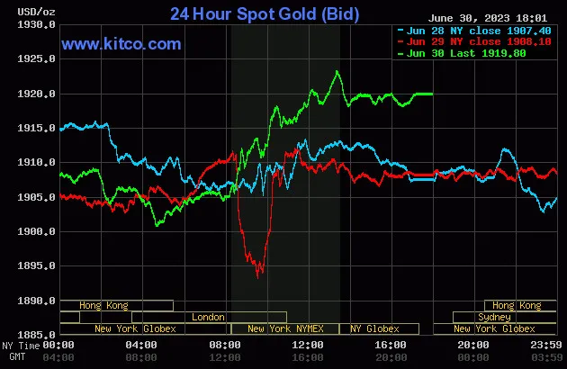Vào lúc 5 giờ 00 phút sáng hôm nay 1/7 (giờ Việt Nam), giá vàng giao ngay thế giới niêm yết trên Kitco neo ở mức 1.919,80 USD/ounce, quy đổi tương đương 55,550 triệu đồng/lượng.