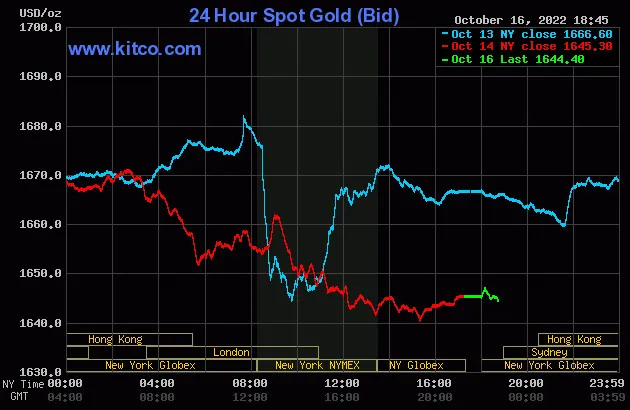 Vào lúc 5 giờ 45 phút sáng hôm nay 17/10 (giờ Việt Nam), giá vàng giao ngay thế giới niêm yết trên Kitco neo ở mức 1.644,40 USD/ounce, quy đổi tương đương 47,823 triệu đồng/lượng.