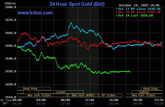 Vào lúc 5 giờ 45 phút sáng hôm nay 20/10 (giờ Việt Nam), giá vàng giao ngay thế giới niêm yết trên Kitco neo ở mức 1.628,6 USD/ounce, quy đổi tương đương 47,907 triệu đồng/lượng.