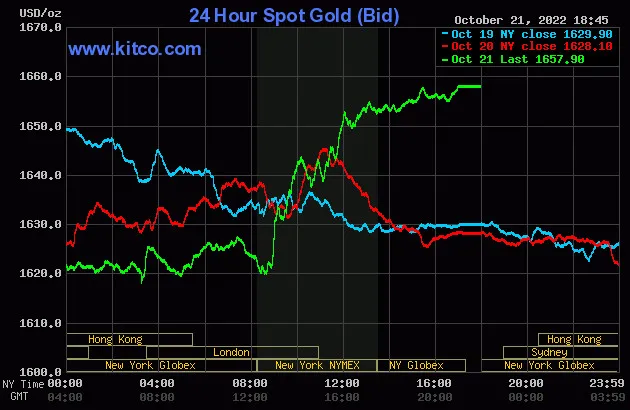 Giá vàng thế giới đóng cửa phiên giao dịch tuần được niêm yết trên Kitco ở ngưỡng 1.657,9 USD/ounce, quy đổi tương đương 49,009 triệu đồng/lượng.