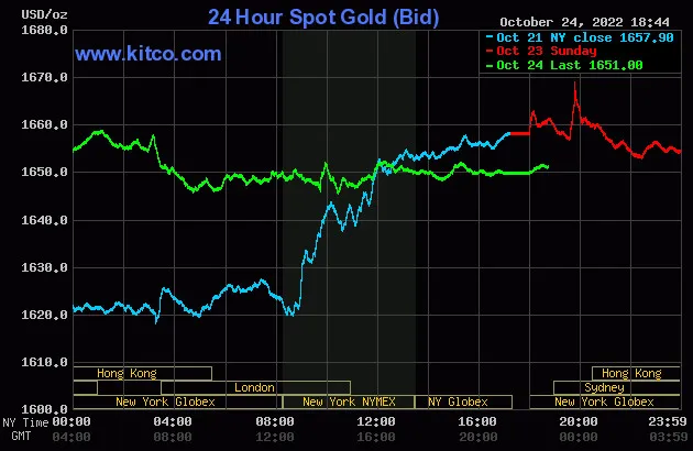 Vào lúc 5 giờ 45 phút sáng hôm nay 25/10 (giờ Việt Nam), giá vàng giao ngay thế giới niêm yết trên Kitco giảm 10,2 USD so với cùng giờ vào sáng hôm qua, neo ở mức 1.651,00 USD/ounce, quy đổi tương đương 49,425 triệu đồng/lượng.