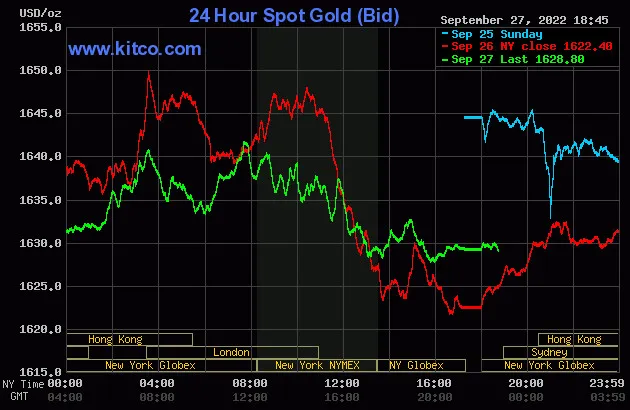 Vào lúc 5 giờ 45 phút sáng hôm nay 28/9 (giờ Việt Nam), giá vàng giao ngay thế giới niêm yết trên Kitco tăng 3,7 USD so với cùng giờ vào sáng hôm qua, neo ở mức 1.628,8 USD/ounce, quy đổi tương đương 46,576 triệu đồng/lượng.