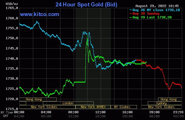 Vào lúc 5 giờ 45 phút sáng hôm nay 30/8 (giờ Việt Nam), giá vàng giao ngay thế giới niêm yết trên Kitco tăng nhẹ 1,6 USD so với cùng giờ vào sáng hôm qua, neo ở mức 1.738,2 USD/ounce, quy đổi tương đương 49,066 triệu đồng/lượng.