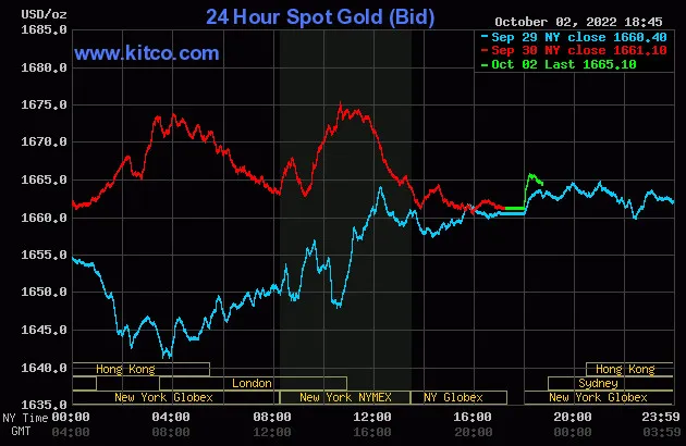 Vào lúc 5 giờ 45 phút sáng hôm nay 3/10 (giờ Việt Nam), giá vàng giao ngay thế giới niêm yết trên Kitco neo ở mức 1.665,10 USD/ounce, quy đổi tương đương 47,898 triệu đồng/lượng.