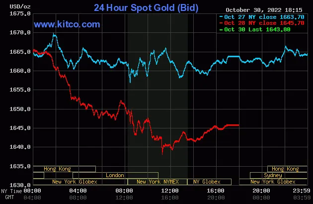 Vào lúc 5 giờ 15 phút sáng hôm nay 31/10 (giờ Việt Nam), giá vàng giao ngay thế giới niêm yết trên Kitco neo ở mức 1.643,80 USD/ounce, quy đổi tương đương 49,200 triệu đồng/lượng.