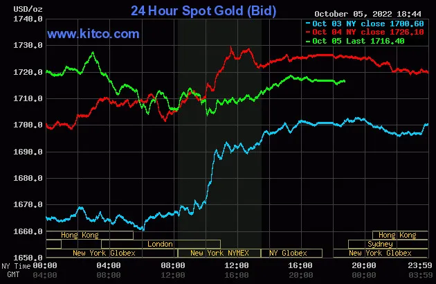Vào lúc 5 giờ 45 phút sáng hôm nay 6/10 (giờ Việt Nam), giá vàng giao ngay thế giới niêm yết trên Kitco giảm 9,4 USD so với cùng giờ vào sáng hôm qua, neo ở mức 1.716,4 USD/ounce, quy đổi tương đương 49,415 triệu đồng/lượng.