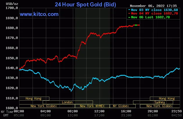 Vào lúc 5 giờ 35 phút sáng hôm nay 7/11 (giờ Việt Nam), giá vàng giao ngay thế giới niêm yết trên Kitco neo ở mức 1.682,70 USD/ounce, quy đổi tương đương 50,444 triệu đồng/lượng.