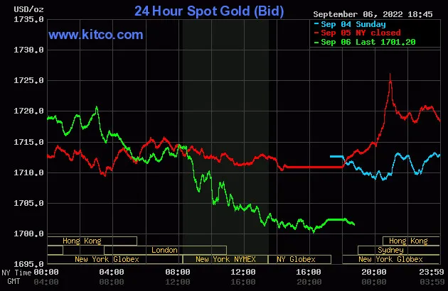 Vào lúc 5 giờ 45 phút sáng hôm nay 7/9 (giờ Việt Nam), giá vàng giao ngay thế giới niêm yết trên Kitco giảm 12,2 USD so với cùng giờ vào sáng hôm qua, neo ở mức 1.701,2 USD/ounce, quy đổi tương đương 48,209 triệu đồng/lượng.