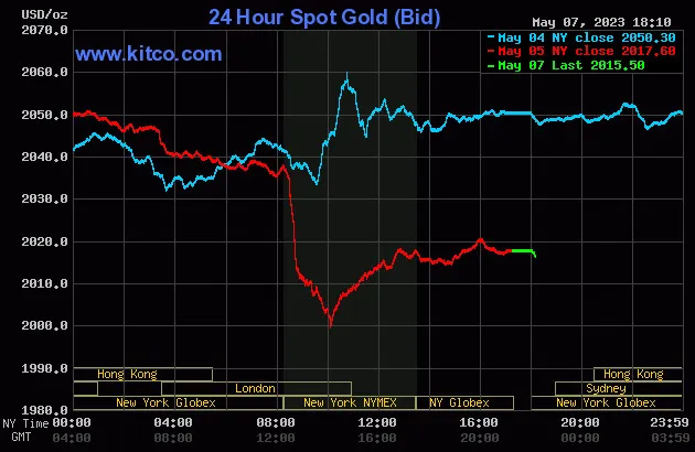 Bước sang cuối tuần, dữ liệu việc làm vững chắc, với nền kinh tế tạo ra 253.000 việc làm trong tháng 4 và thu nhập trung bình mỗi giờ tăng 0,5% so với tháng trước làm lu mờ những kỳ vọng đó, khiến giá vàng giảm xuống mức thấp nhất trong ngày cuối tuần là 2.007 USD/ounce.