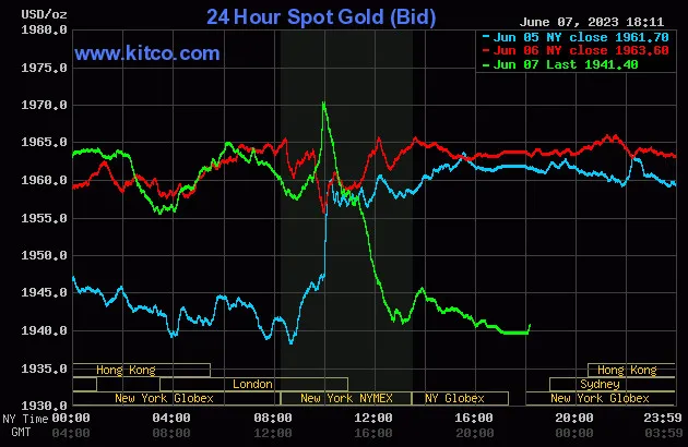 Vào lúc 5 giờ 10 phút sáng hôm nay 8/6 (giờ Việt Nam), giá vàng giao ngay thế giới niêm yết trên Kitco neo ở mức 1.941,40 USD/ounce, quy đổi tương đương 55,962 triệu đồng/lượng.